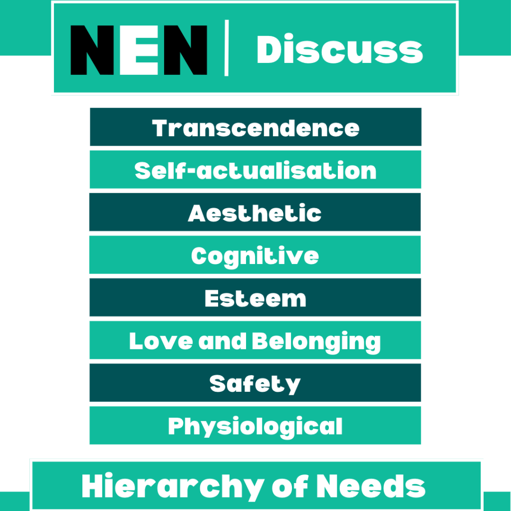 In addition to the other two additional needs, Maslow also includes a new ‘need’ at the top of the Hierarchy. This is the need, or to more acutely describe it, the concept of transcendence. Transcendence involves moving beyond one’s individual self and connecting with something greater. Due to this connection to something greater, transcendence is also often called Spiritual needs. This can take many forms, such as finding purpose and meaning in life, contributing to a larger cause, or experiencing a sense of fulfilment and satisfaction from being part of something bigger than oneself. Transcendence is seen as the ultimate goal of human development, and only a minority of individuals are believed to reach this level of self-actualisation.